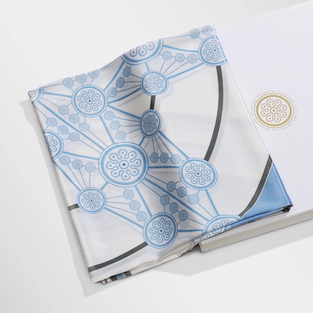 柔軟的絲巾布料印有神秘的線性矩陣圖騰,這個圖騰是從高維度的訊息中得到的啟示,是一種與之接通的暗號。