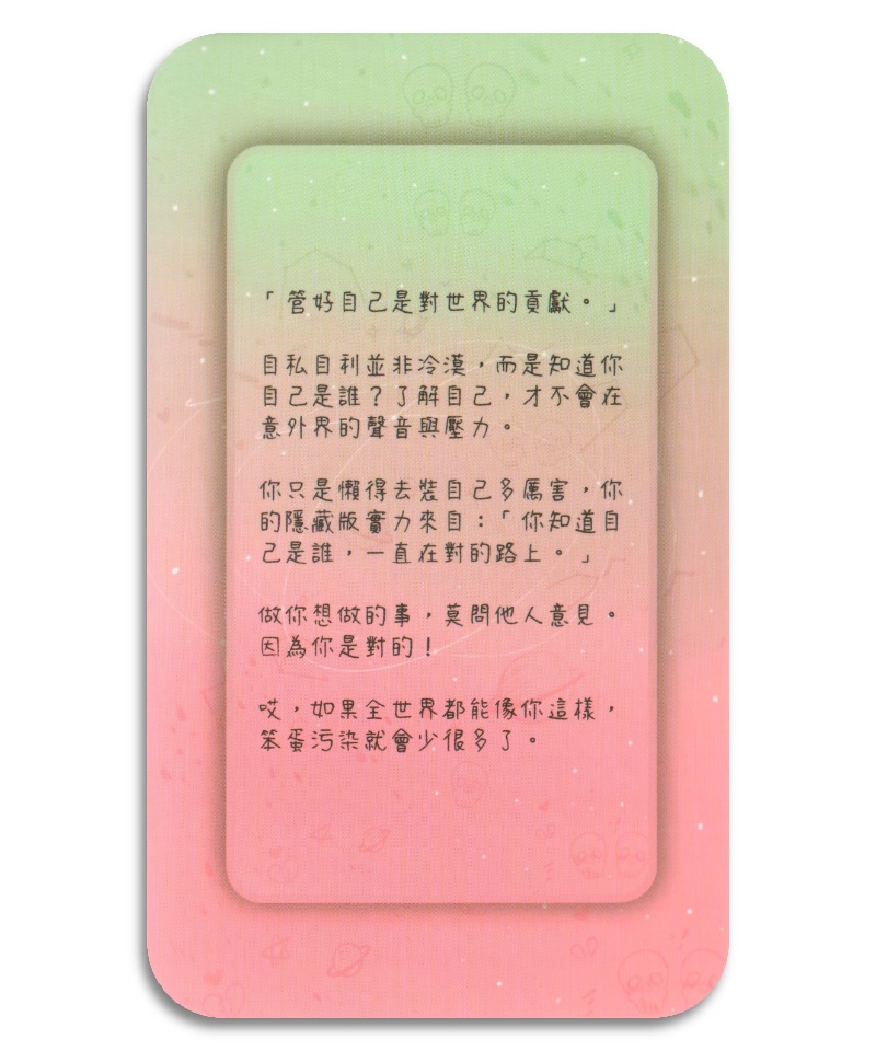 你的問題可以大至跟男友要不要分手?小至最近是不是要減個肥?全都隨你抽牌問,每張牌的文字都能直接重擊心臟後,再讓你會心一笑!